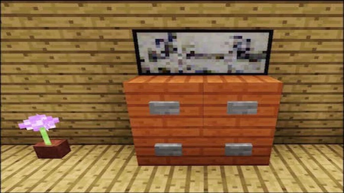 To store all your clothes, personal belongings, and other apparel, placed a dresser in the room. There is no Minecraft dresser, but you can create it by placing two long chests on top of each other.